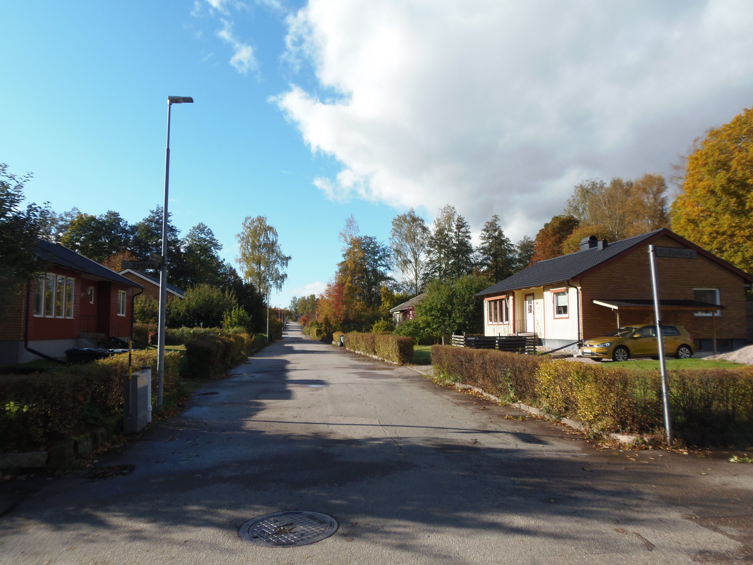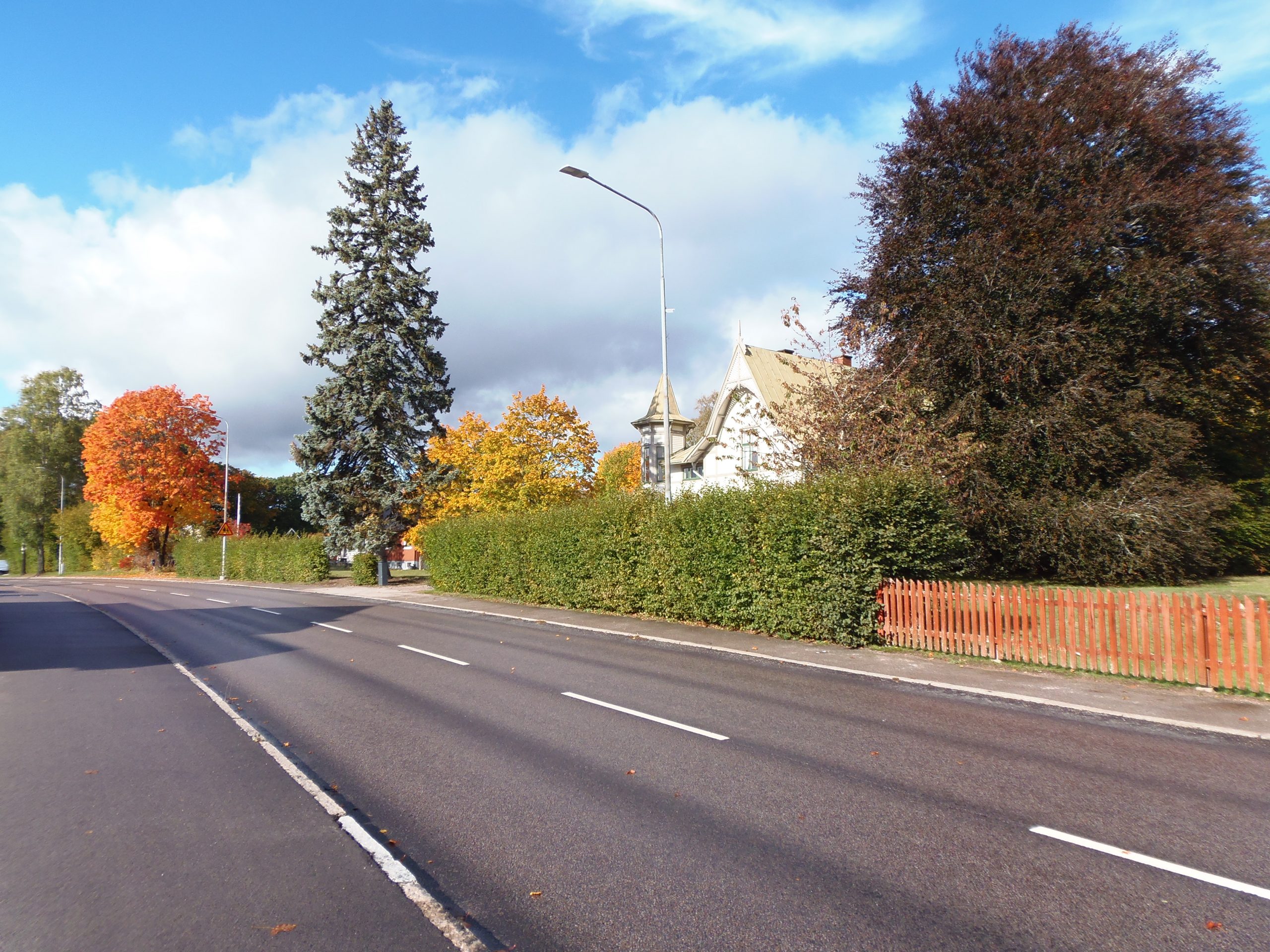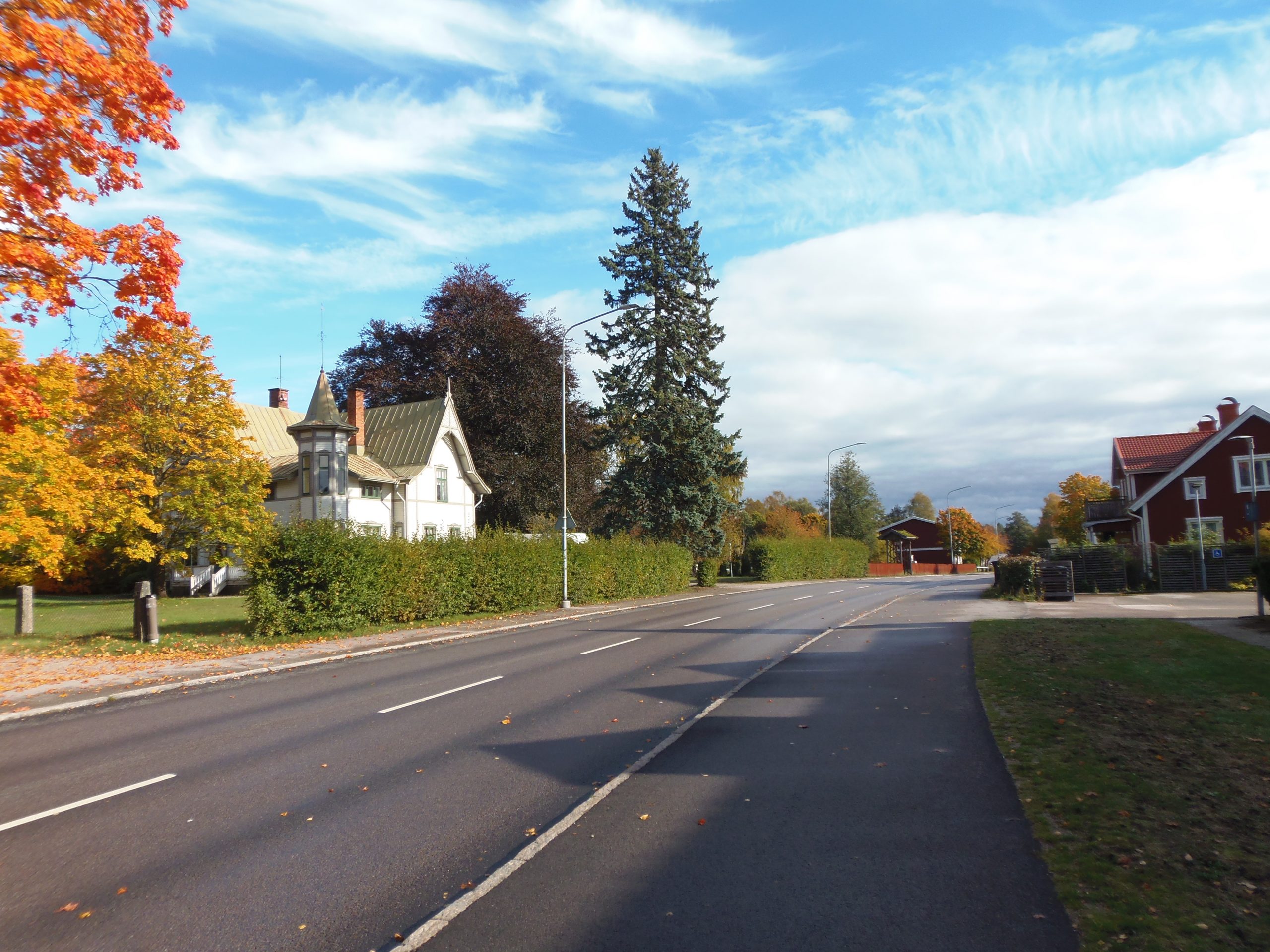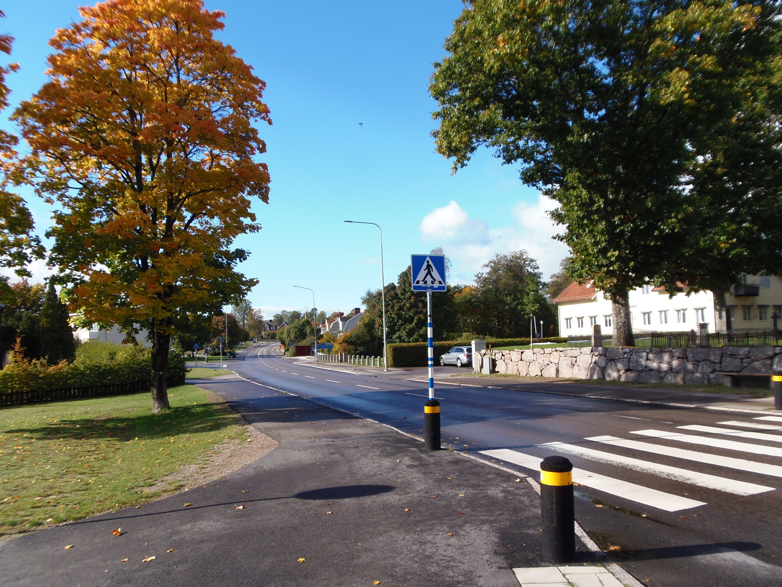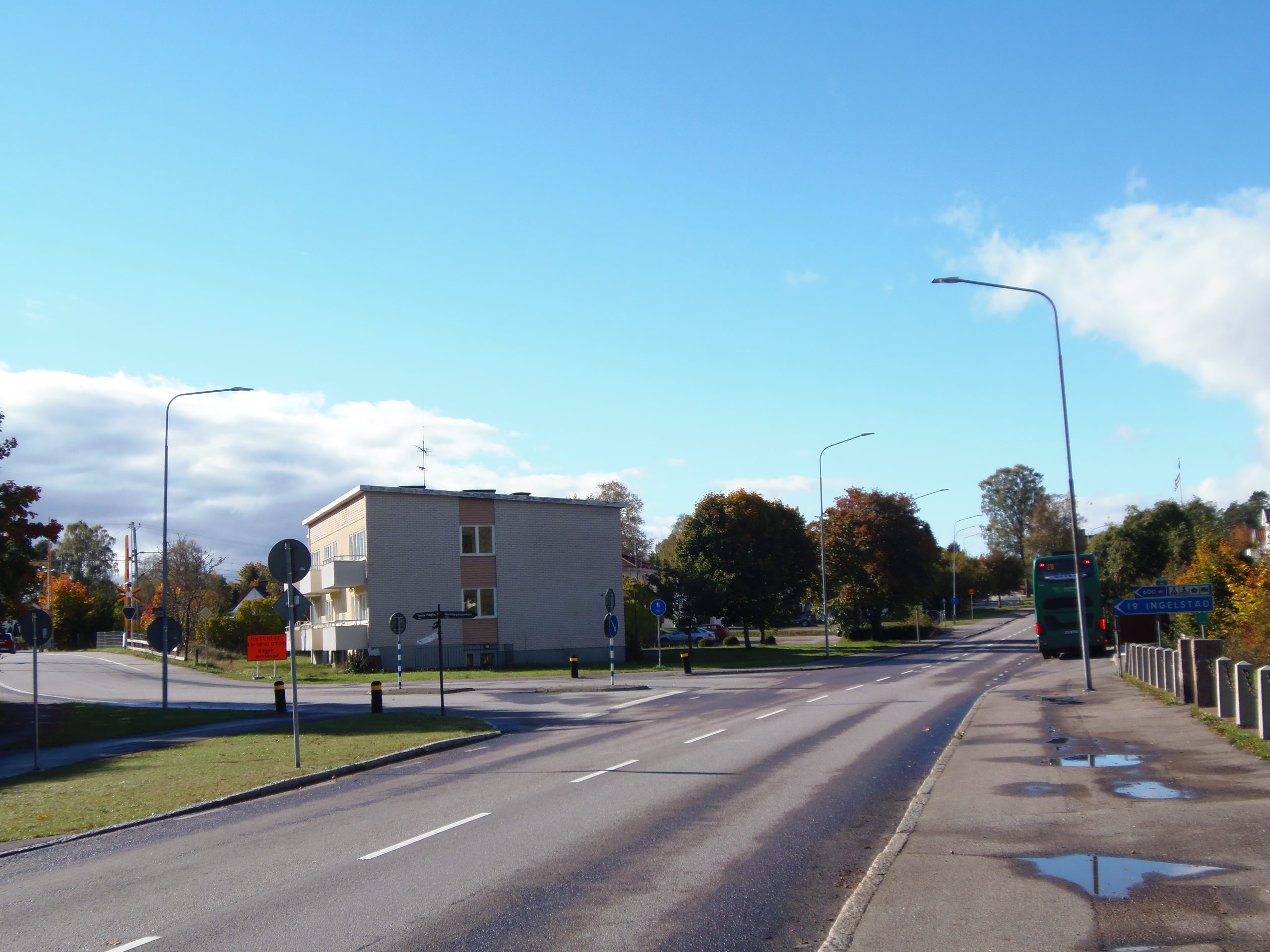 Hauptstraße mit Doppeldeckerbus in der Haltebucht und links die Straße / Landstraße nach Ingelstad. Geradeaus der Zubringer zur RB 25.