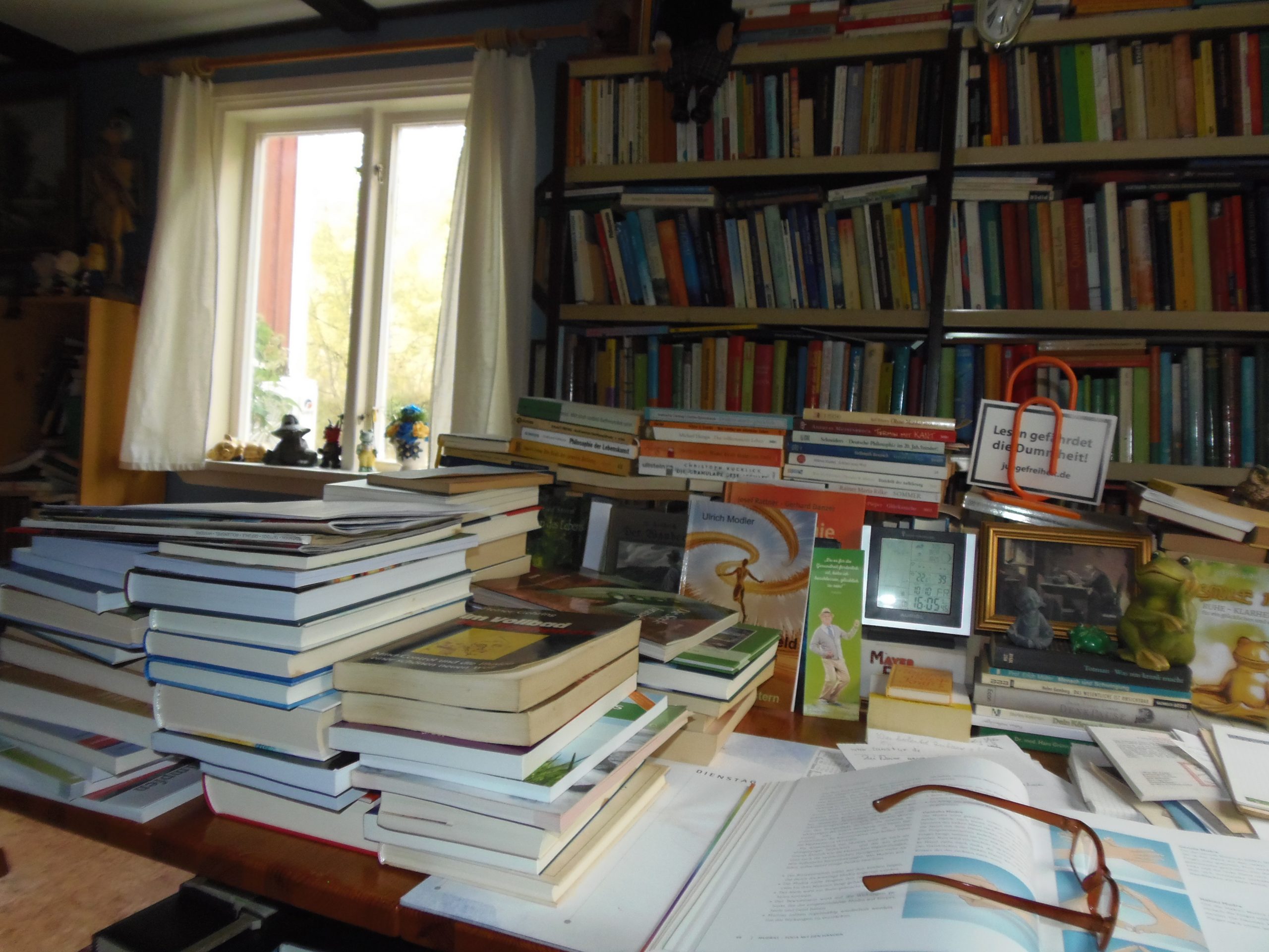 Und dies ist meine Fantasiewelt, 🙂 der linke Bücherstapel ist meine Arbeit für die nächste Zeit.