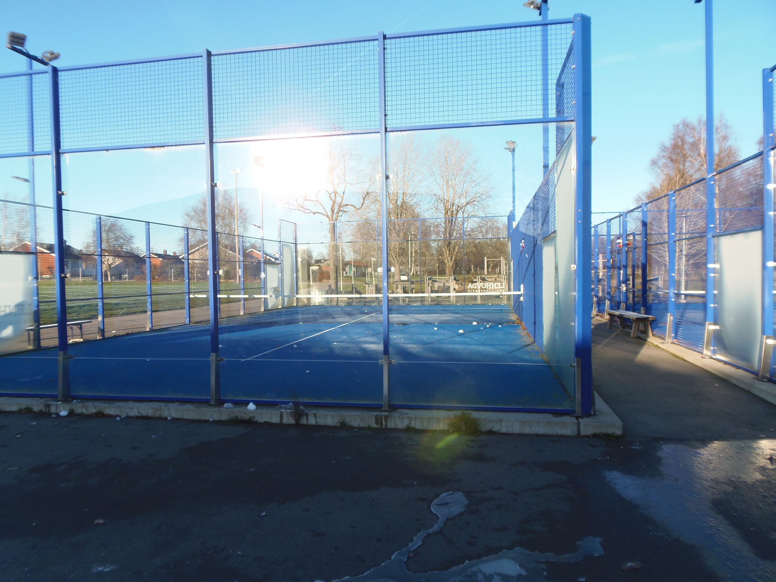Blick in den Park. Rechts das Gebäude ist die Eissporthalle.