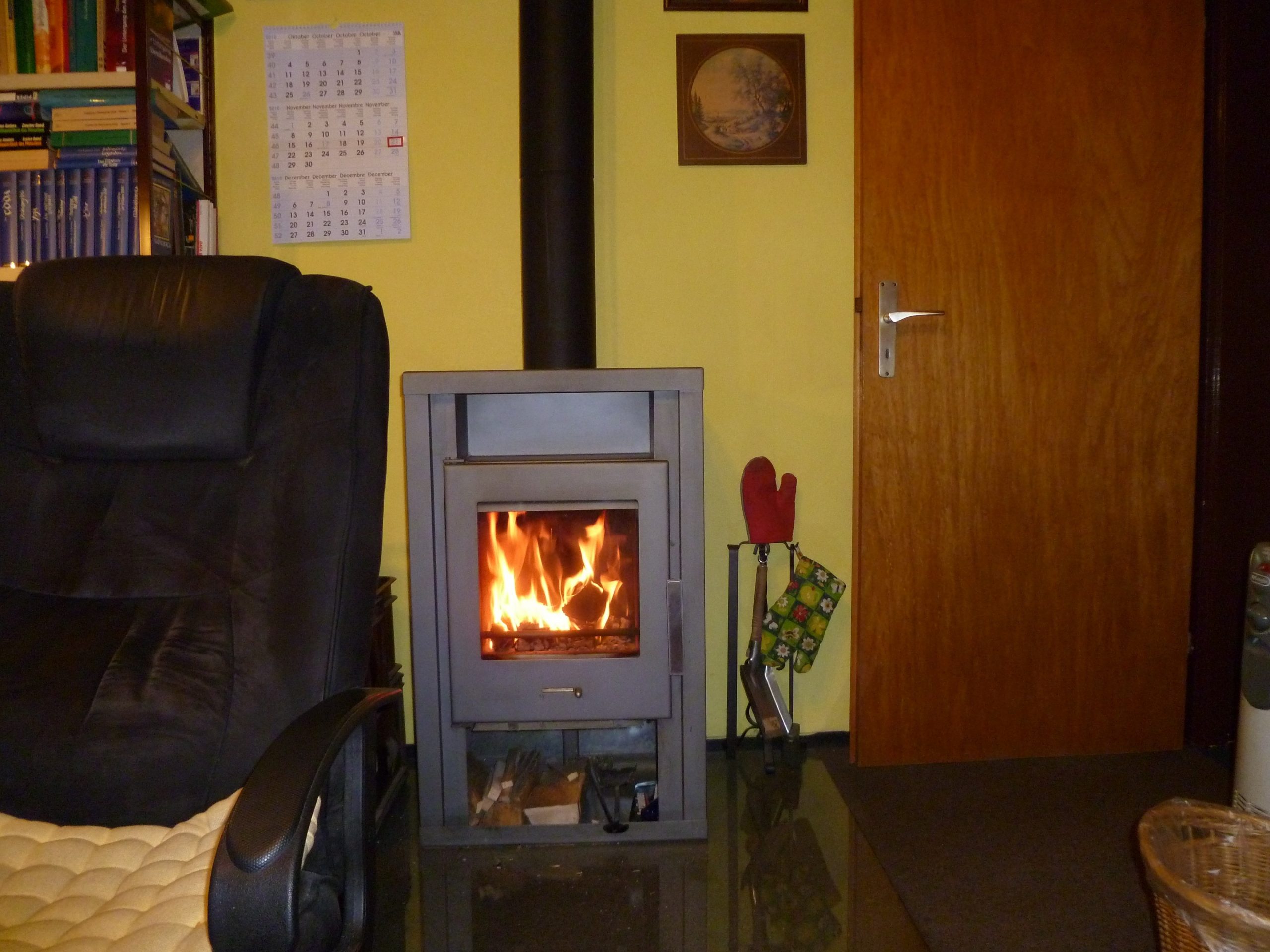 Mein Kaminofen im Arbeitszimmer in Wössingen. Im Vergleich zu hier, wo wir nur elektrisch heizen, kommt demnächst ein Vergleich auch von den Kosten her. Im November war es ein Jahr, dass wir eine Luft – Wärme – Pumpe betreiben. Auch unten im Haus unserer Tochterfamilie und in den Gästeunterkünften. Die Vor – und Nachteile und eben der Kostenfaktor.