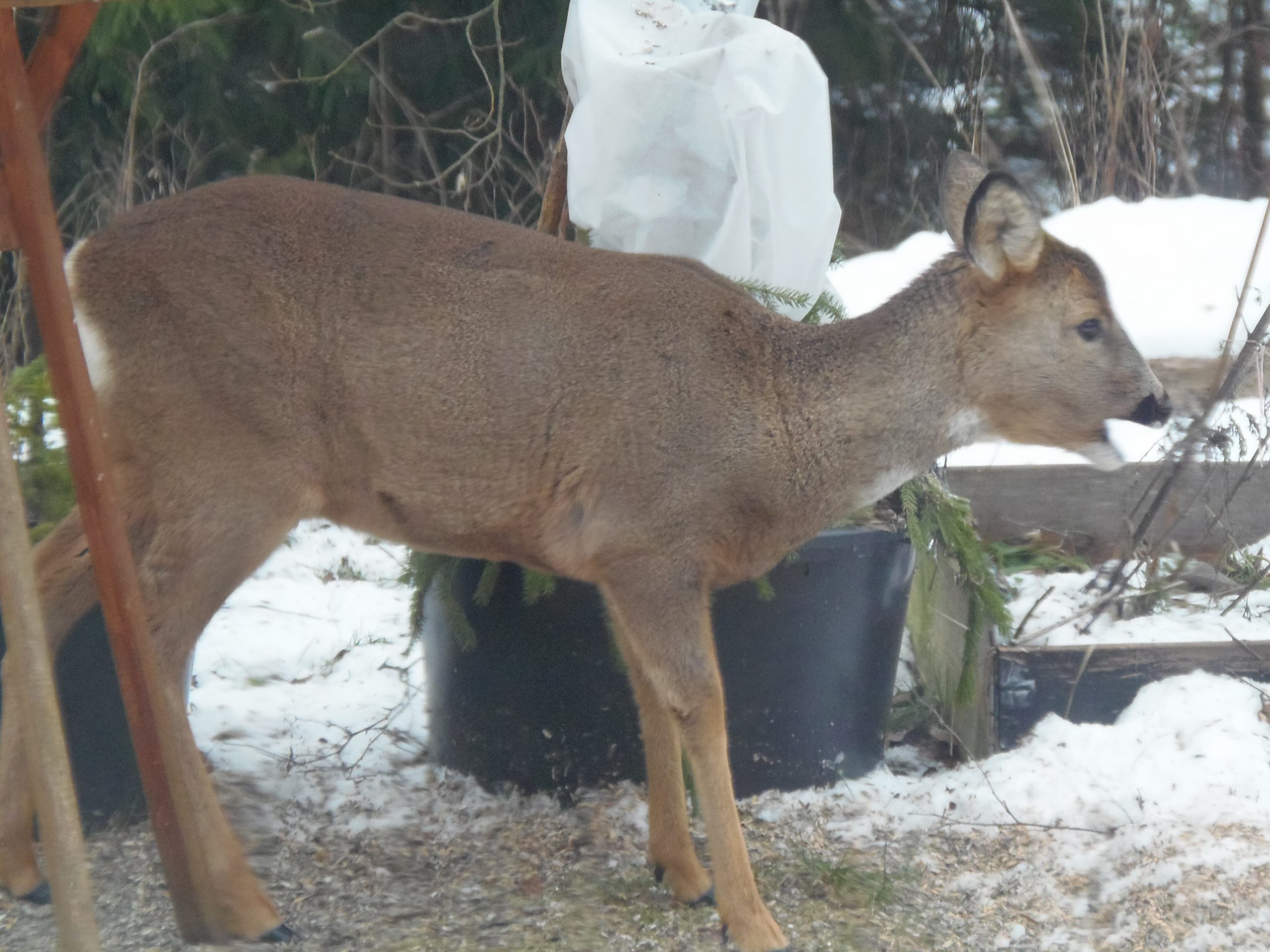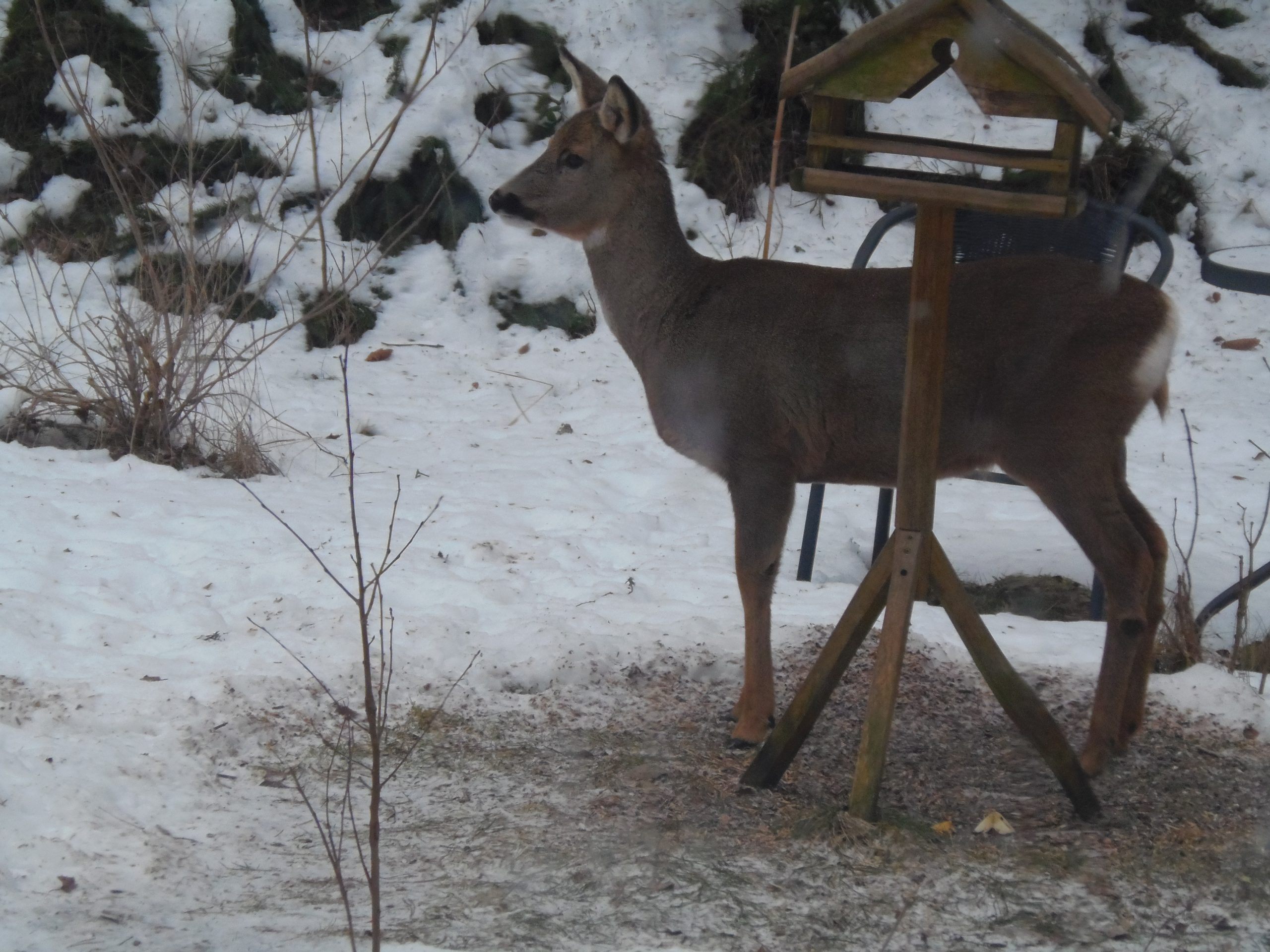 Wir haben jetzt mindestens zwei Rehkostgänger bei uns hier oben. Unten beim Tochterhaus kommen zwei Rehe immer über die Bachbrücke zum Fressen.