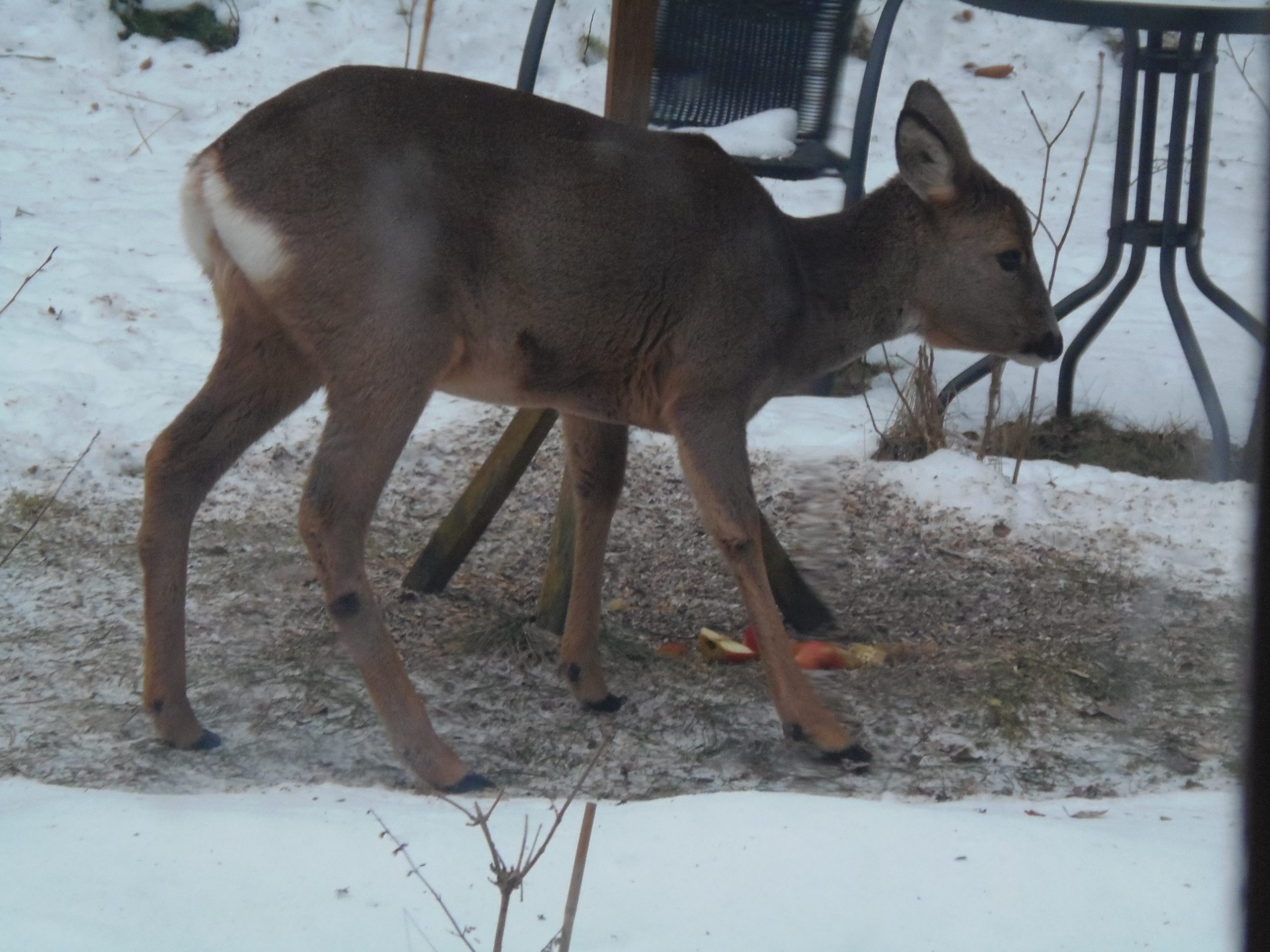 Beide Rehe sind noch nicht ausgewachsen und somit auch noch nicht so alt. Habe diesem Reh zugeschaut, wie es genüsslich gespeist hat. Wir schneiden Äpfel in kleinere Stücke und gekochte Kartoffeln, mit Haferflocken angereichert gibt es auch noch.