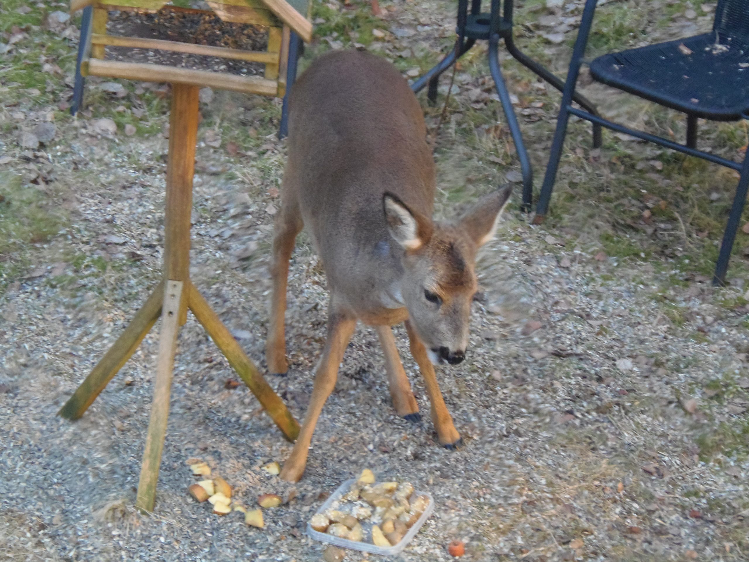 Unser Rehkostgänger kommt immer noch regelmäßig. Es hat jetzt die Vorliebe für gedünstete Mohrrüben entdeckt. Habe es heute wieder länger beobachtet. Wir dachten ja, wenn der Schnee weg ist kommt es nicht mehr.