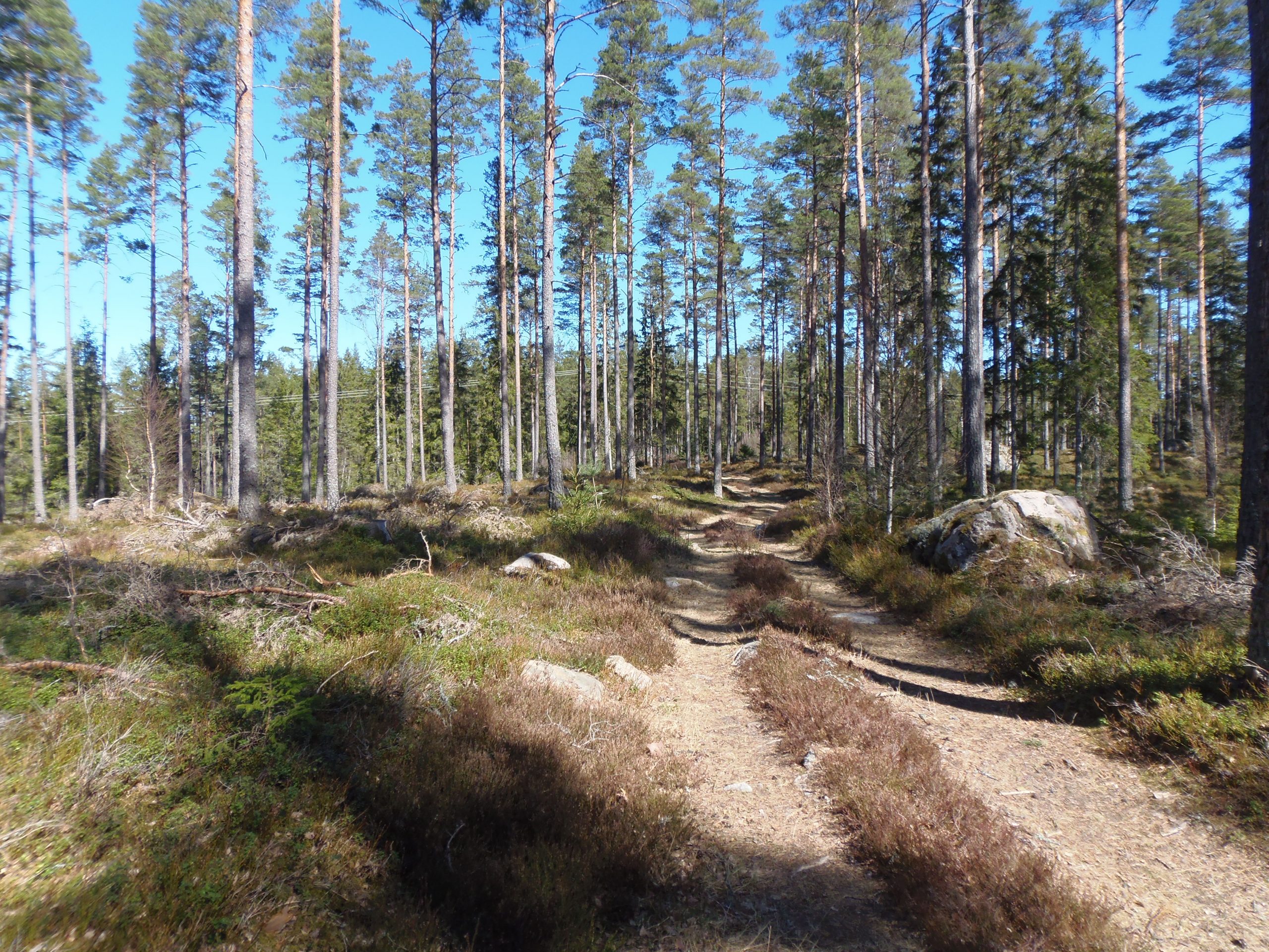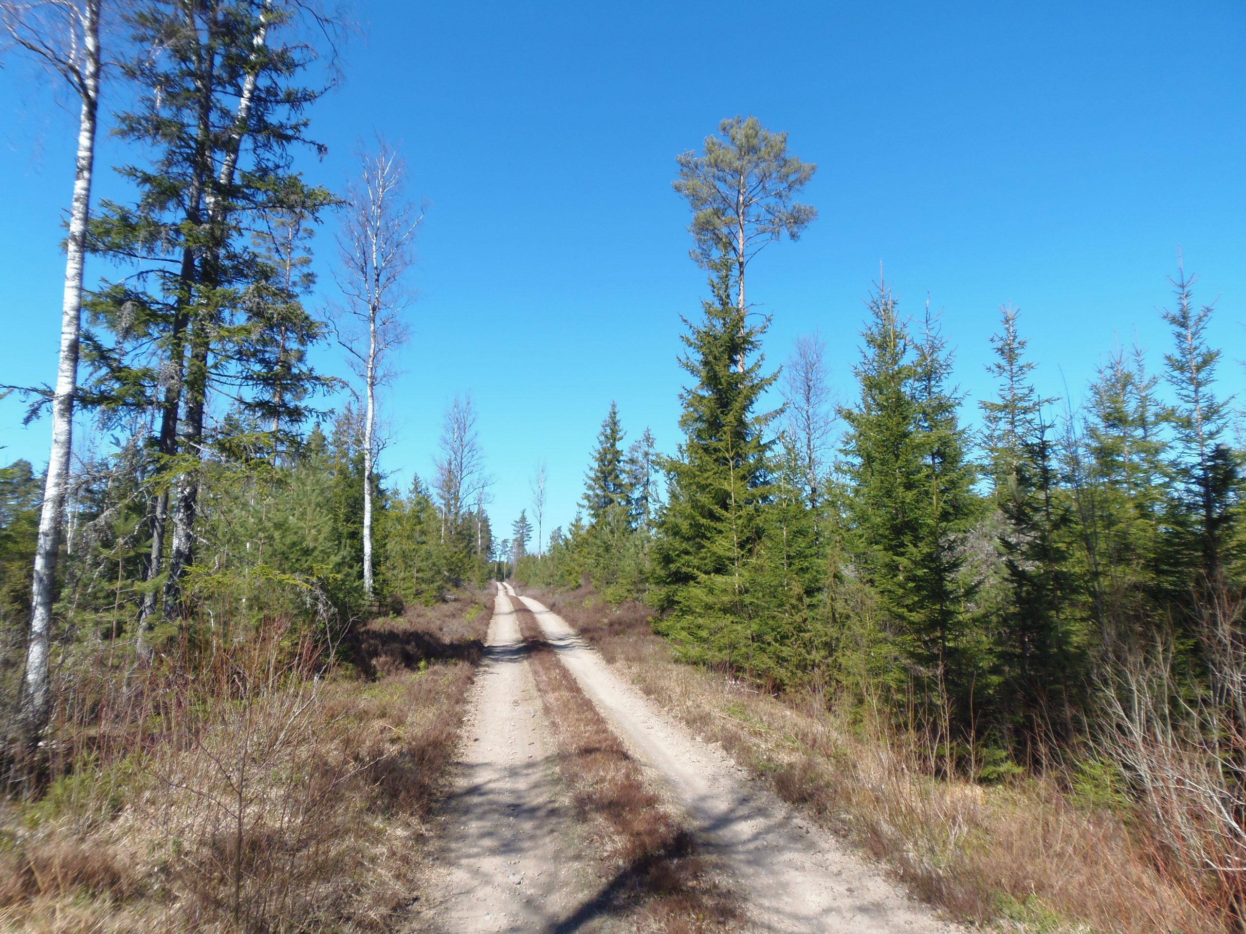 Dieser Waldweg führt zu einem alten und einem neuen Bauernhof an der Landstraße nach Bergdala. Die führt ja auch weitgehend über kleine Weiler und durch Wald. Dort könnte man wieder in verschiedenen Waldwegen einbiegen und z. B. nur durch Wald bis Hovmantorp fahren / gehen.